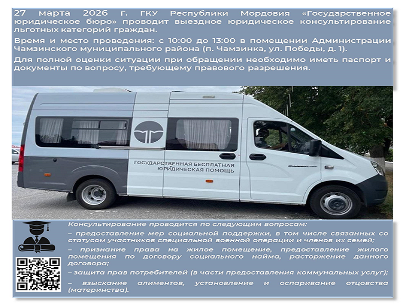 27 марта 2026 г. ГКУ Республики Мордовия "Государственное юридическое бюро" проводит выездное юридическое консультирование льготных категорий граждан